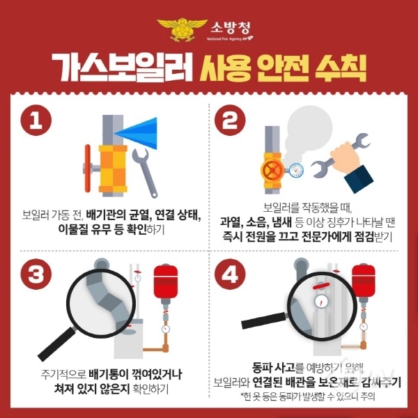 이에 소방서는 ▲보일러 가동 전 배기관 균열·연결상태·이물질 유무 등 확인 ▲보일러 작동 시 과열·소음 등 이상징후 나타날 시 즉시 전원 끄고 점검 받기 ▲배기관 연결부 고정 확인 ▲전문가를 통한 안전점검 받기 등의 안전수칙 준수를 당부했다.