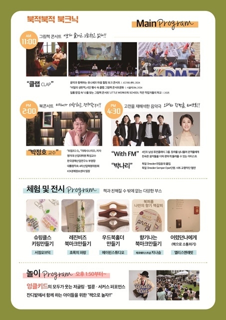 주요 프로그램은 연호공원 빈백쇼파에 앉아 책을 보는 자율독서 시간을 비롯해, 클랩스튜디오 라이브 연주팀이 함께하는 그림책 공연, ‘4차 산업혁명에서 더 책이 필요한 이유’라는 주제로 진행될 박정호 교수의 북콘서트, 동화⋅소설의 장면을 음악과 함께 재구성한 피날레 음악극으로 구성해 방문객들에게 책과 음악, 문화가 어우러진 다채로운 경험과 독서의 매력을 느끼는 시간을 만들어 줄 것으로 기대된다.