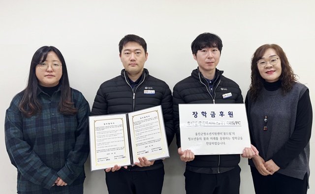 울진군 청소년지원센터 ‘꿈드림’은 지난 1월 8일 ‘옵티멀에너지(주) 한울사업소 풋살 동호회(회장 배광선)’와 업무협약(MOU)을 체결하고 장학금 전달식을 가졌다.