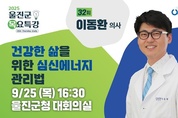 울진군(군수 손병복)은 오는 9월 25일 오후 4시 30분 울진군청 대회의실에서 ‘교육하는 의사’ 이동환 의사를 초청해 ‘건강한 삶을 위한 심신에너지 관리법’을 주제로 제32회 목요특강을 개최한다. 이동환 의사는 직무스트레스연구소 원장이자 유튜브 구독자 110만 명을 보유한 건강 전문 크리에이터로, 다수의 방송과 저서를 통해 대중에게 쉽고 실천 가능한 건강 관리법을 전해왔다. 이번 특강은 일상에서 바로 실천할 수 있는 건강 관리 방법을 다루며, 특히 현대인이 겪는 만성피로와 스트레스 해소를 위한 구체적 대안을 제시해 군민들에게 실질적인 도움이 될 것으로 기대된다. 손병복 울진군수는 특강에 앞서 “바쁜 일상 속에서도 몸과 마음의 균형을 지키는 것이 무엇보다 중요하다”며 “이번 특강을 통해 군민들께서 건강을 관리하는 새로운 지혜를 얻고, 더 행복하고 활력 있는 생활을 이어가시길 바란다”라고 말했다. 한편, 제33회 목요특강은 오는 10월 16일(목) 오후 5시, 울진문화예술회관에서 개최할 예정이며, 방송인 서경석을 초청해 ‘작은 변화가 미래를 바꾼다’를 주제로 강연이 진행될 예정이다. 최태하 기자