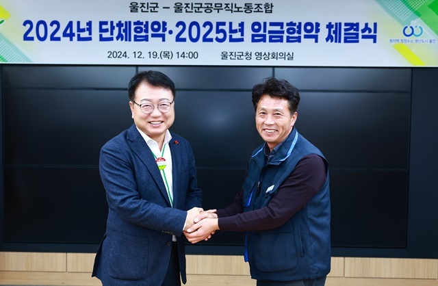 울진군(군수 손병복)은 지난 19일, 울진군공무직노동조합과 2024년 단체협약 및 2025년 임금협약을 체결하고, 공무직 직원들의 처우 개선에 합의했다.