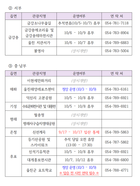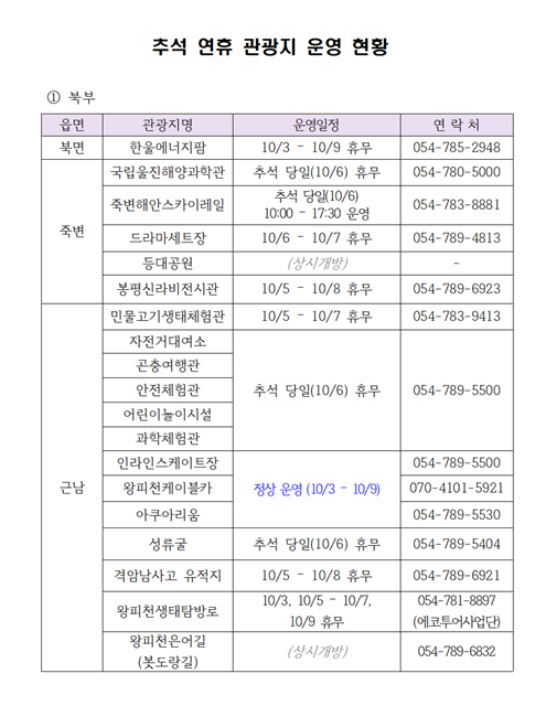 주요 관광지 휴무 및 운영 현황을 살펴보면 ▲국립울진해양과학관과 성류굴, 왕피천공원 내 시설물은 추석 당일인 10월 6일 휴관하며, ▲죽변해안스카이레일, 왕피천케이블카, 아쿠아리움은 연휴 기간 내내 정상 운영된다.