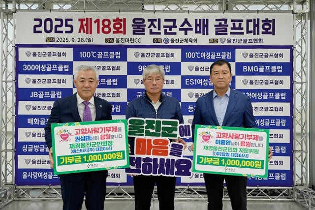울진군(군수 손병복)은 지난 9월 28일 개최된 제18회 울진군수기 골프대회에서 재경울진군민회 권성태 회장과 (주)탑씰 이종엽 대표로부터 각각 100만 원씩, 총 200만원의 울진군 고향사랑기부금을 기탁받았다.