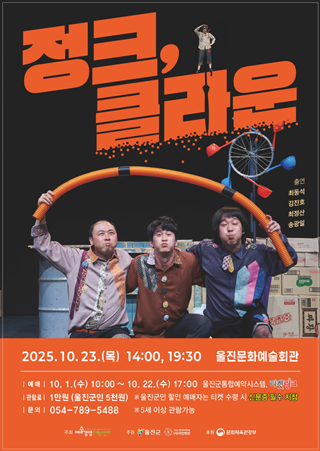 울진군(군수 손병복)은 오는 10월 23일 오후 14시, 19시 30분, 울진문화예술회관에서 2025 공연예술 유통 지원사업에 선정된 코믹 마임극 ‘정크, 클라운’ 공연을 두차례 선보인다.