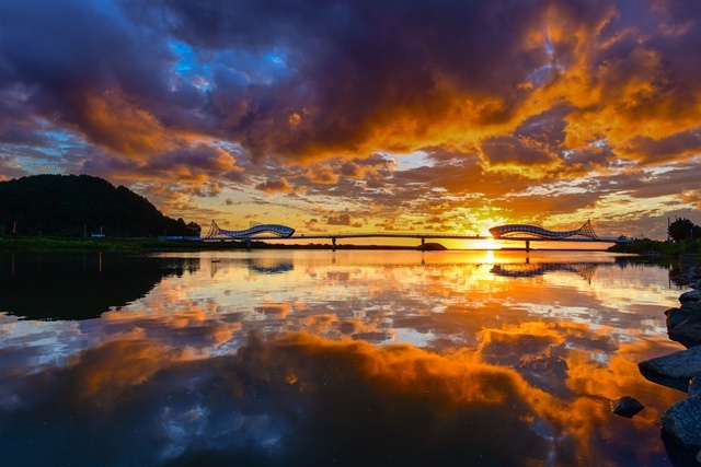 붉은 여명이 남대천으로 번지며 은어다리가 선명한 존재감을