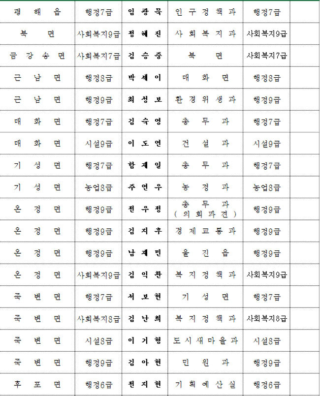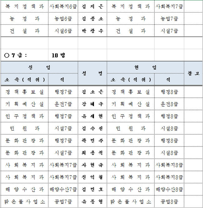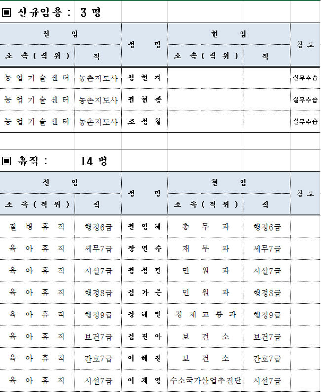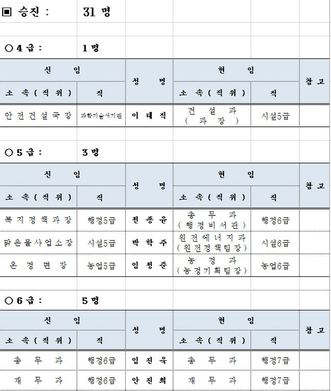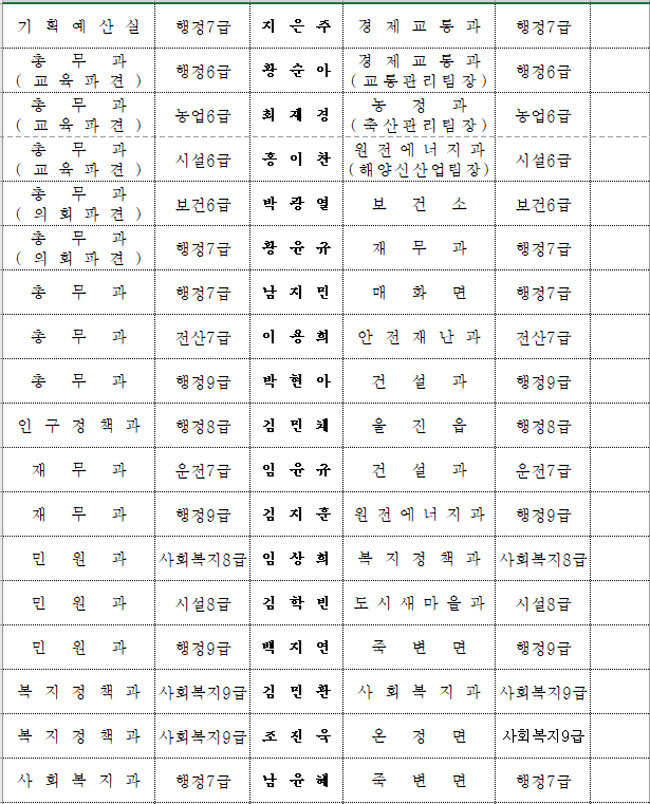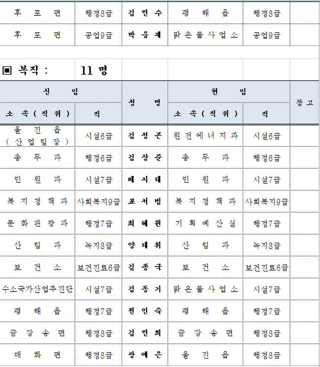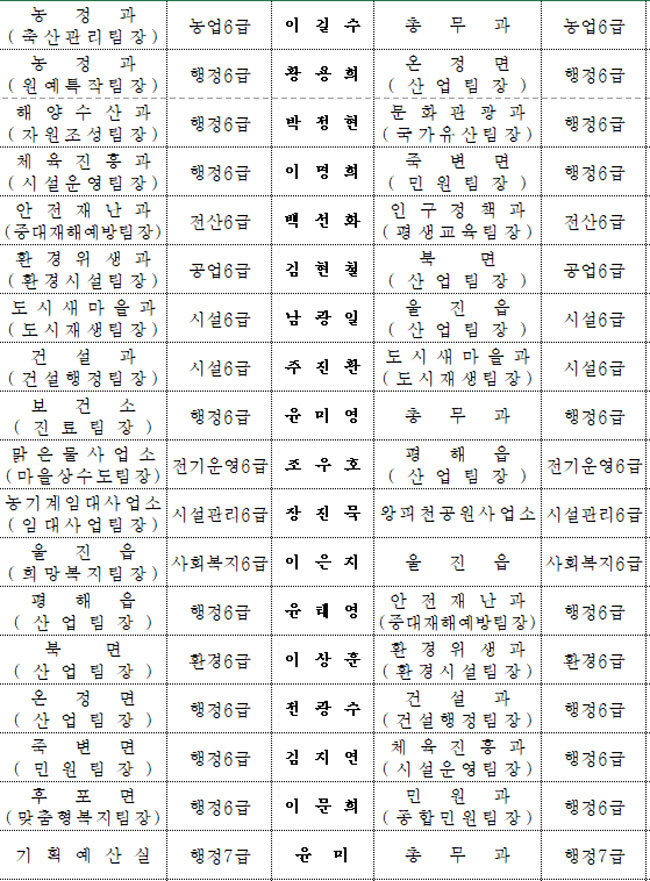 울진군은 1월 1일자 승진 31명, 전보 113명, 복직 11명, 신규임용 3명, 휴직 14명 총 172명에 대한 인사를 했다.