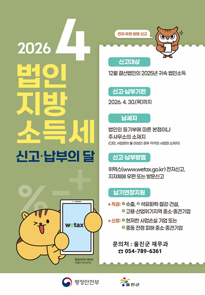 울진군은 4월 한 달간 법인지방소득세 집중신고·납부기간을 운영한다.