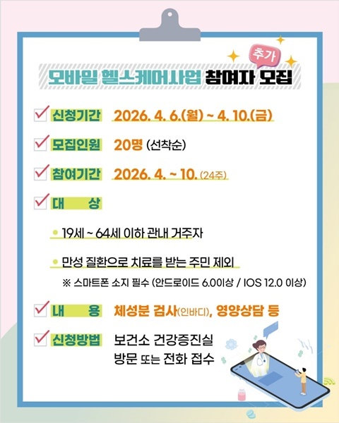 울진군은 지역주민의 자가 건강관리 능력 향상과 만성질환 예방을 위해 ‘모바일 헬스케어사업’대상자 20명을 4월 6일부터 4월 10일까지 추가 모집한다고 밝혔다.
