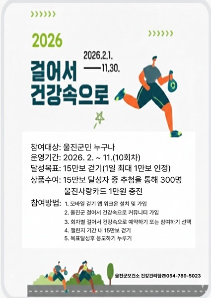 울진군은 2026년 건강걷기 실천 분위기 조성을 위해 ‘걸어서 건강속으로’ 챌린지를 2026년 2월 1일부터 11월 30일까지 총 10개월간 운영한다.