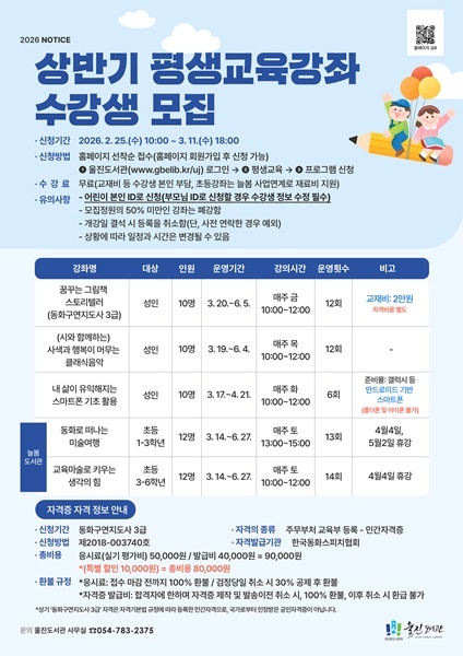 경상북도교육청 울진도서관(관장 임현진)은 오는 3월부터 6월까지 ‘상반기 평생교육강좌 및 늘봄도서관’을 운영한다.