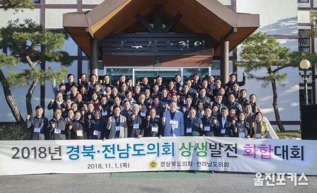 경북도의회는 11월 1일 전남 광양시에서 전남도의회와 “2018년 경북‧전남도의회 상생발전 화합대회”를 개최했다. 영호남 화합과 지역균형발전을 위해 경북도의회와 전남도의회는 2015년 “상생발전 교류협약”을 체결하여 양 지역의 현안사업 해결과 거대 수도권에 대한 공동대응을 통해 동반성장을 꾀하고 있다.
