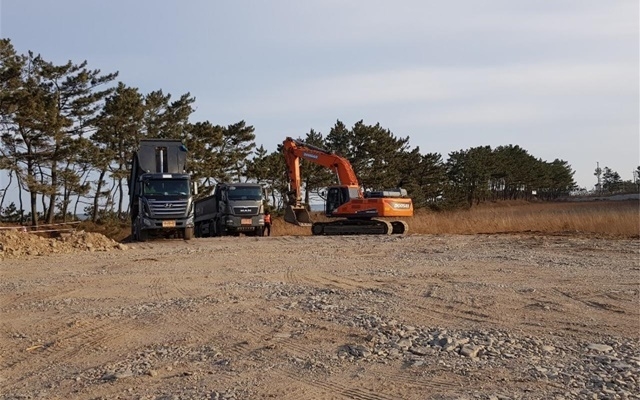 이 부지조성에 필요한 약 15만㎥의 골재는 경북도와 협의해 평해 남대천 재해복구사업 반출 골재를 확보하였으며, 각종 인허가 등을 신속하게 진행하여 현재 순조롭게 성토용 토사반입이 이루어지고 있다.