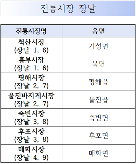 울진군은 오는 2월 11일 흥부시장을 시작으로 2월 14일까지 관내 6개 전통시장을 대상으로 ‘설맞이 전통시장 장보기 행사’를 개최한다.