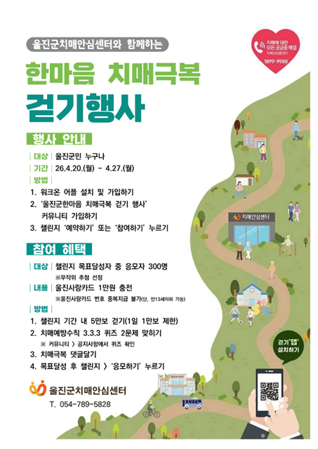 울진군은 치매 예방의 중요성을 알리고 치매에 대한 인식을 개선하기 위해 2026년 한마음 치매극복 비대면 걷기행사를 운영한다.